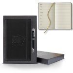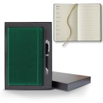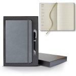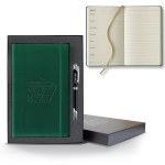 Ivory Perpetual Weekly Notes measuring 5 1/4″ x 8 3/8″, this journal features our most popular cover, which is a smooth-soft texture that’s often mistaken for leather and comes with a sleek back gift box and black or gunmetal pen! Red, white, and blue pens also available upon request. It’s FSC ® certified, elastic closure, 128 ivory pages Perpetual Weekly and Notes format and gold ribbon marker. Choose from an assortment of cover colors and customize it with an imprinted company name, logo or marketing message for brand exposure. Great for any promotion all year long! FSC MIX 70% CQ-COC-000479. 5.25″ W x 8.38″ H x 0.5″ D
