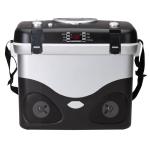 This 30 can, 20 liter cooler box is equipped with a CD player, 1/8″ AUX input and cable, and an AM / FM radio with quality stereo speakers, an adjustable shoulder strap and an auto power plug. Complies with Prop 65. 14″ W x 12 3/4″ H x 11″ D