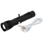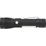 Function button switches between 4 modes: high (front), low (front), high (barrel) and high (front & barrel) Features an adjustable light beam by push/pull focusing action Includes 1 x 18650 rechargeable battery, USB charging cable and adjustable clip Approx 4-5 hours of charge time Approx 90 minutes of run time Aluminum body Output: up to 400 Lumens (barrel) and 350 Lumens (front) Bulb Type: 5W LED (front) and COB (barrel). 5.375″ D x 1.375″ W x 1.375″ H