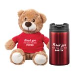 Chester Teddy Bear/Tumbler Gift Set Includes…G006-T – Chester the Teddy Bear- Super soft plush, stuffed teddy bear- Soft plush snout, ears and short tail- Dressed with fashionable T shirtD118 – Juno Tumbler 12oz- Polished, single wall travel tumbler- Easy flip spout with spill proof closure- Screw on lid for maximum leak protection. 8.0″ W x 9.0″ H x 6.0″ D