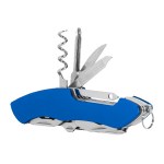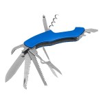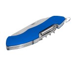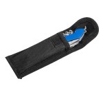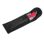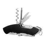 10-in-1 stainless steel multi-tool with: knife, phillips screwdriver, serrated fish scaler (with hook disgorger), scissors, can opener, bottle opener, slotted screwdriver, corkscrew, needle, manicure file with reamer, and mini split key ring. Stores in black polyester carry case with belt loop (included). 4″ D x 0.5″ H x 1″ W