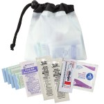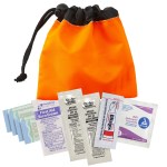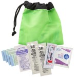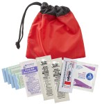 Constructed of 190T nylon. Push-button adjustable cord clasp. Includes 4 latex-free bandages, 2 sunscreen packets, 1 antiseptic towelette, 1 first aid cream packet and 1 Blistex packet. 5″ H x 5″ W x 1/2″ D