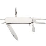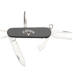 The Classic 6-Function Golf Knife is a golfer’s essential multi-purpose tool, featuring six stainless steel functions to keep your game on point. Packaged in a durable nylon pouch with a hook and loop fastener closure and a convenient belt loop, it’s always within reach on the course.Functions include: – Cleat tightener- Divot repair tool- Cutting blade- Bottle opener – Screwdriver- KeychainProduct Size: 3.25″ W x 1″ H. 3.25″ W x 1.0″ H