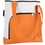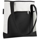 600D polyester 2-tone large capacity tote. Bright white with bold color accents; black piping and long handles. Double front pockets: one zipper and one air mesh. 4-3/4″ gusset. 4.75″ D x 14″ H x 16.5″ W
