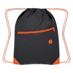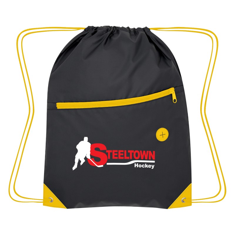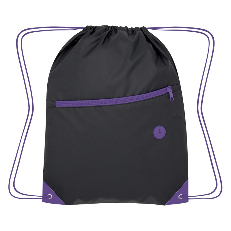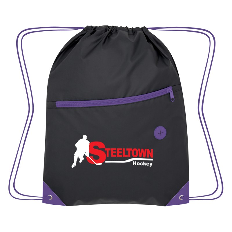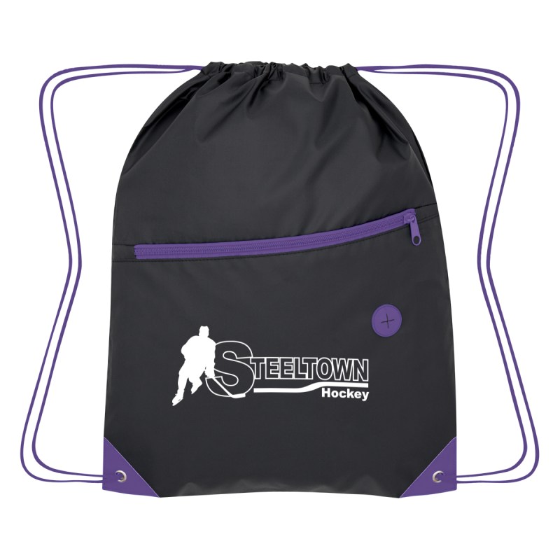 Made Of 210D Polyester. Large Front Zippered Pocket. Built-In Slot For Earbuds. Reinforced Eyelets. Drawstring Closure. Spot Clean/Air Dry. Complies with Prop 65. 13.5″ W x 17.75″ H
