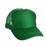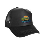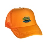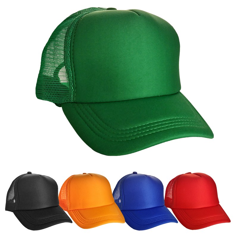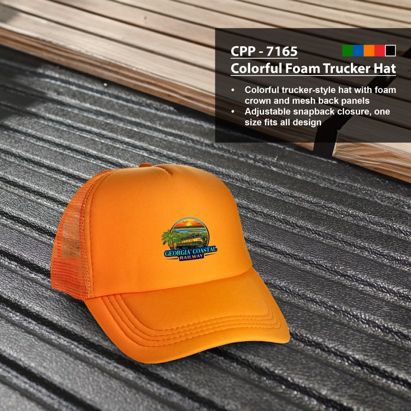 Colorful trucker-style hat with foam crown and mesh back panels. Adjustable snapback closure, one size fits all design.