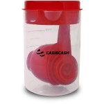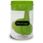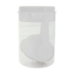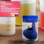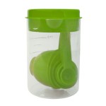 Easy to store 8 piece set. Colorful measuring cups and spoons inside a 2 cup container: 1/2 tsp, 1 tsp, 1/2 tbsp, 1 tbsp, 1/4 cup, 1/3 cup. Lid contains pouring/straining spout. Avoid placing in the dishwasher or microwave; this product is free of BPA. Complies with FDA, Prop 65. 3.4″ Diameter x 5″ H