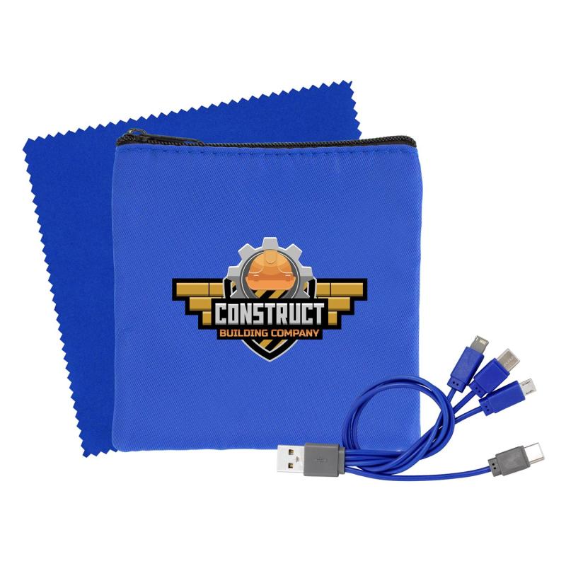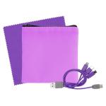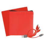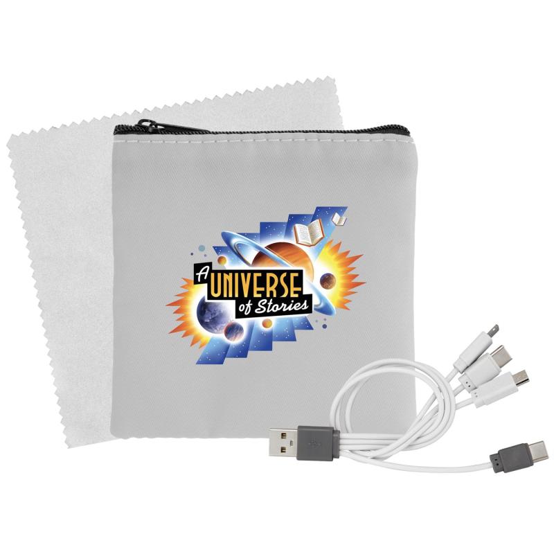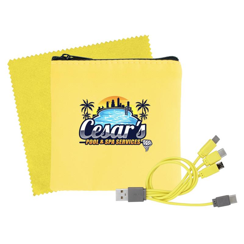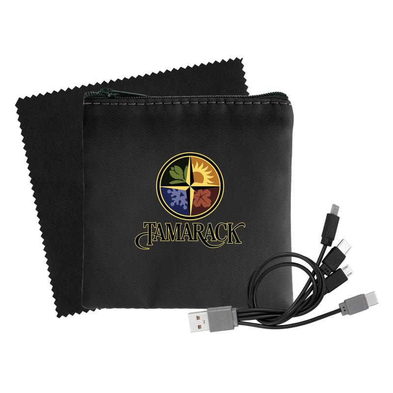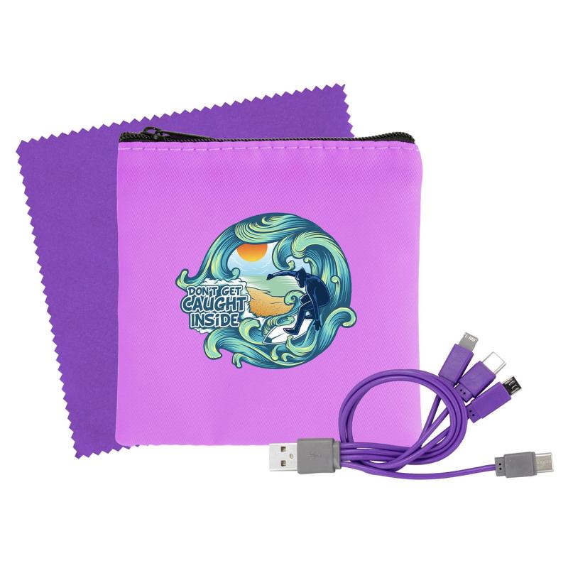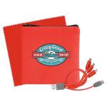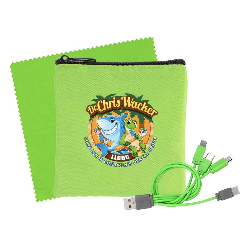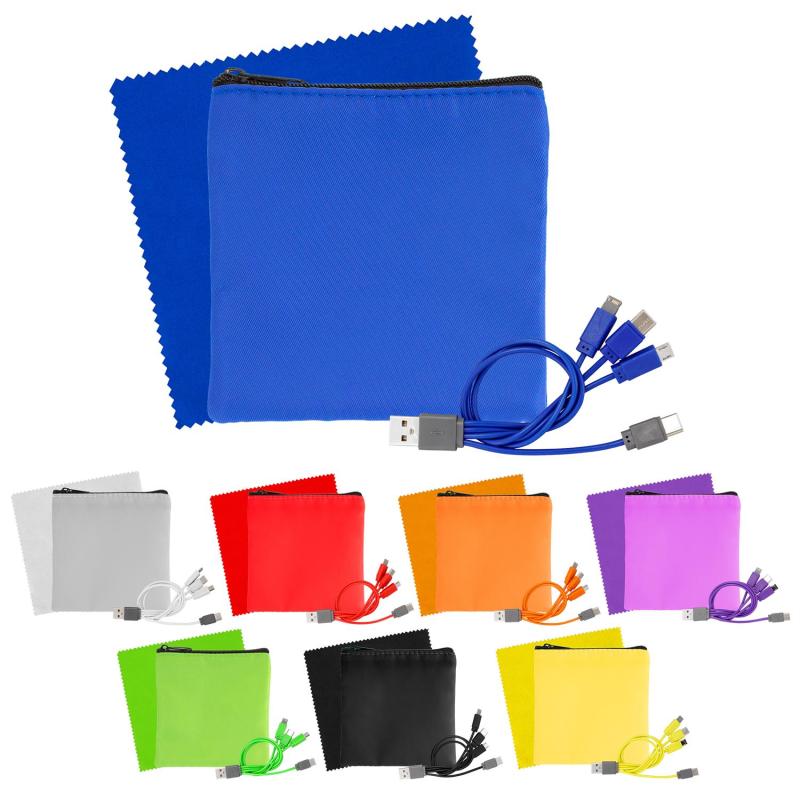 RPET Tech Pouch made from recycled PET. Colorful 4-in-1 charging cable; Multiple USB adapter. Compatible with IOS devices, Micro USB, Type C USB; Patented. USB and Type C USB input. Colorful 5 x 5 RPET Cleaning Cloth. Complies with CE, Prop 65. 4″ L x 4″ H