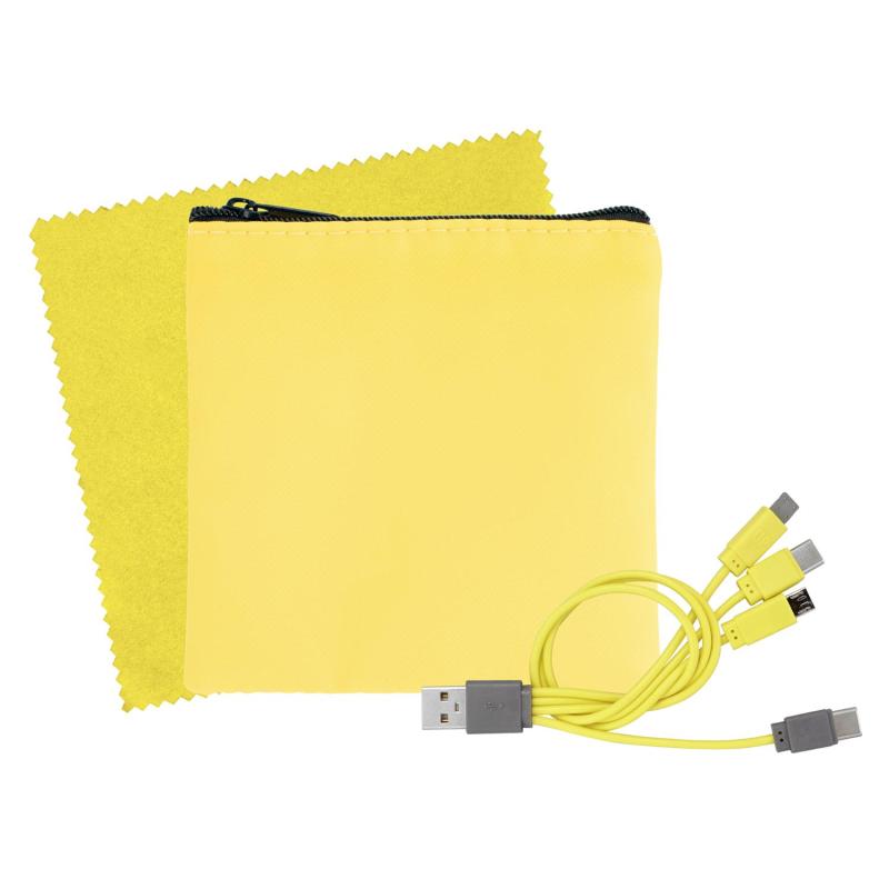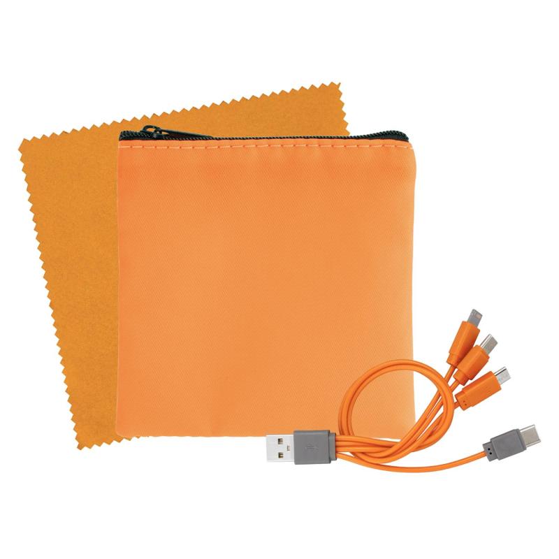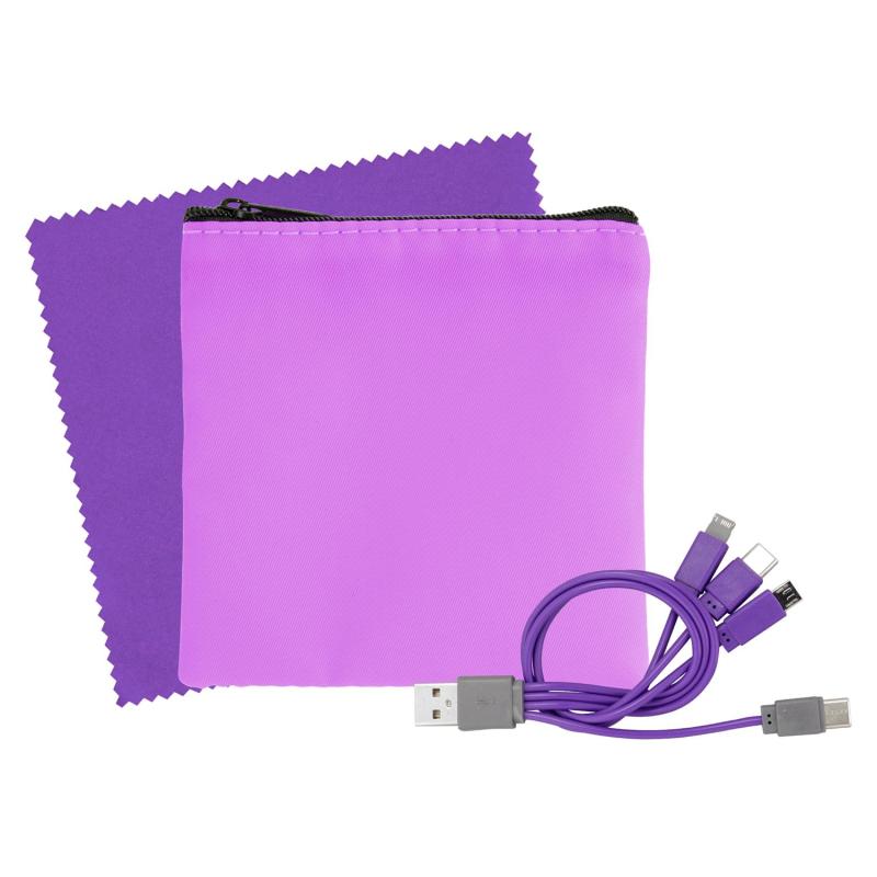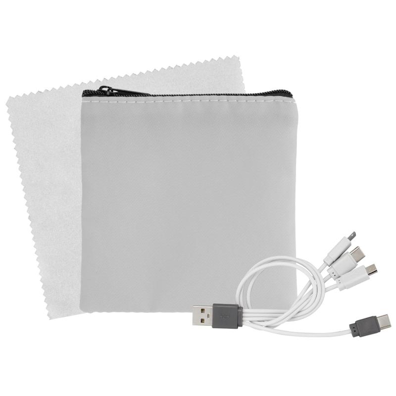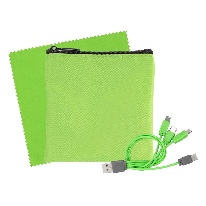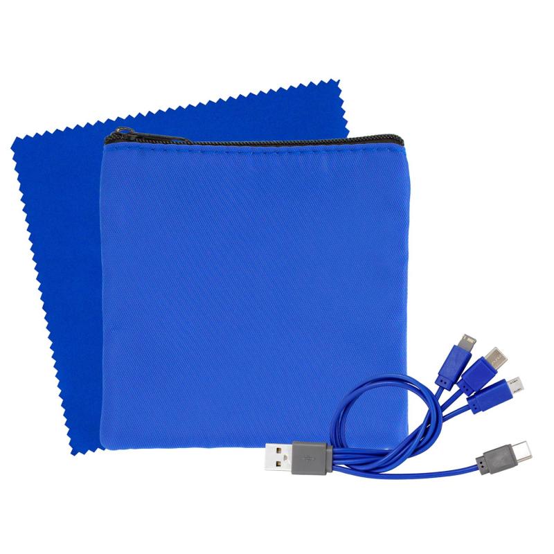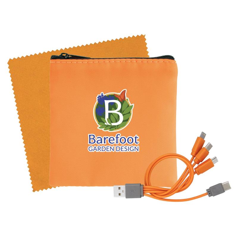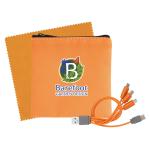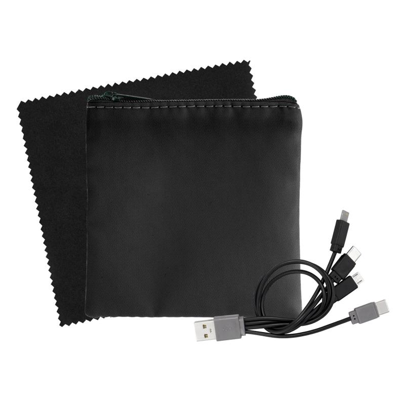 RPET Tech Pouch made from recycled PET. Colorful 4-in-1 charging cable; Multiple USB adapter. Compatible with IOS devices, Micro USB, Type C USB; Patented. USB and Type C USB input. Colorful 5 x 5 RPET Cleaning Cloth. Complies with CE, Prop 65. 4″ L x 4″ H