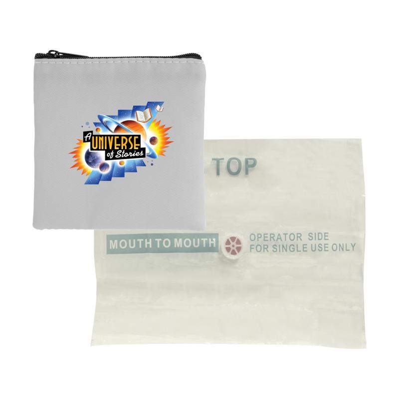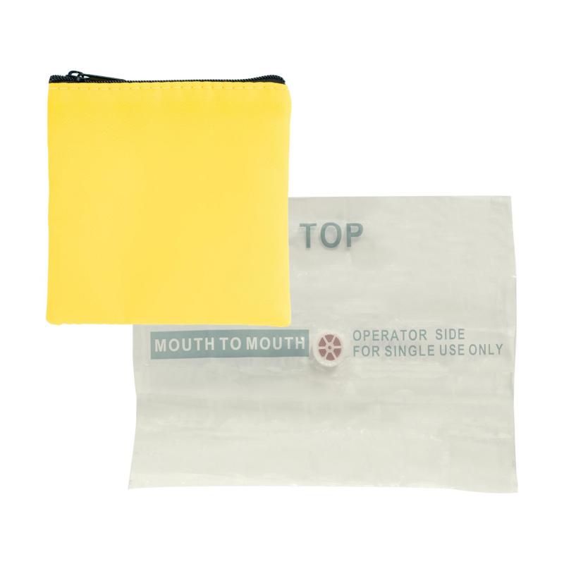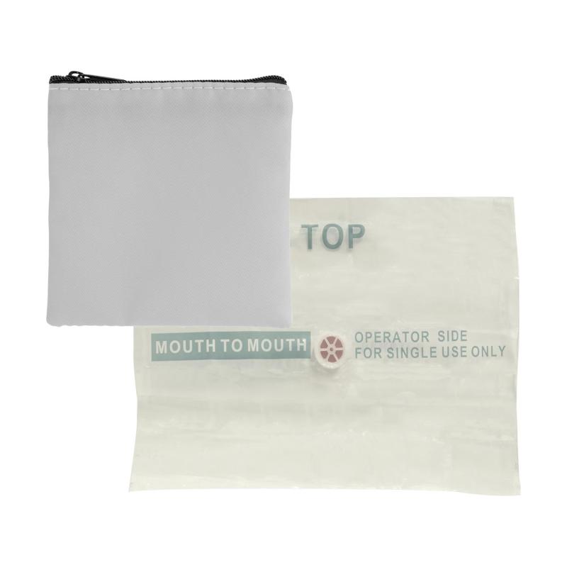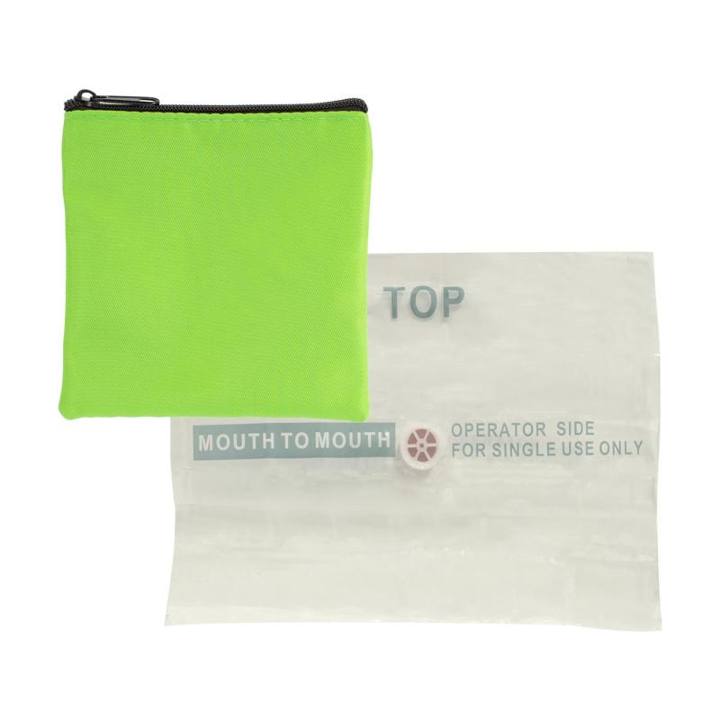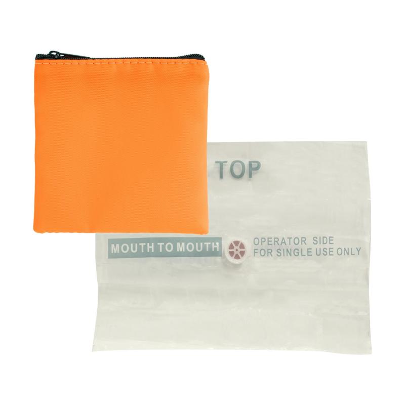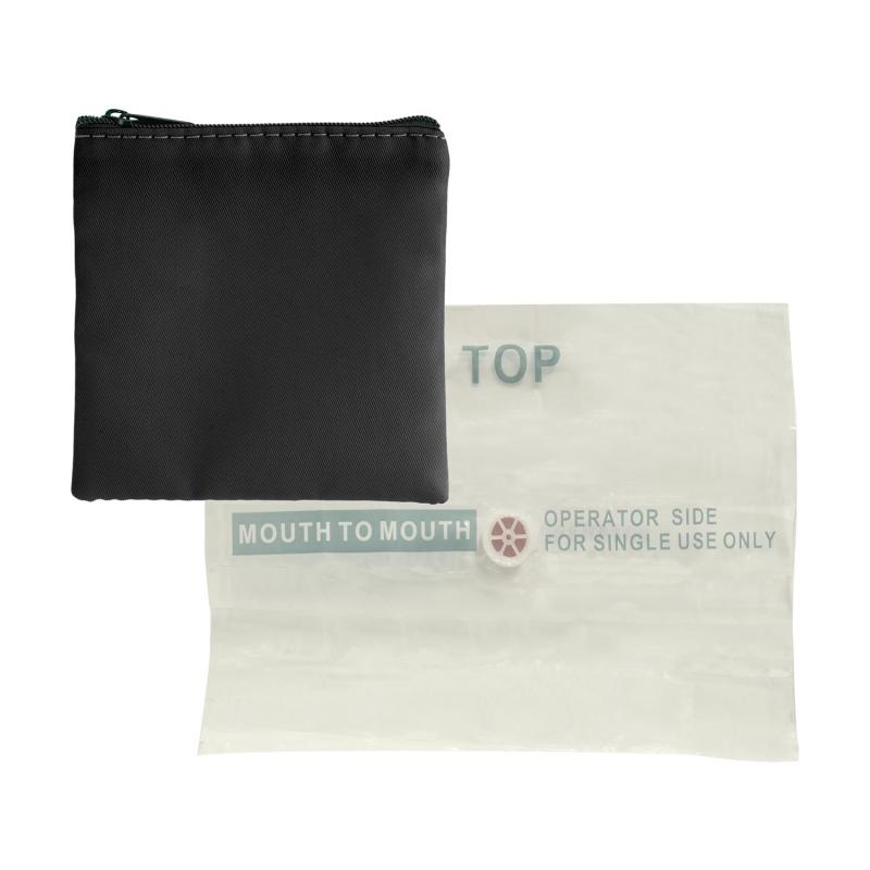 RPET Tech Pouch with zip closure. Disposable Single use CPR face shield with one way valve. Complies with Prop 65. 4″ L x 4″ H