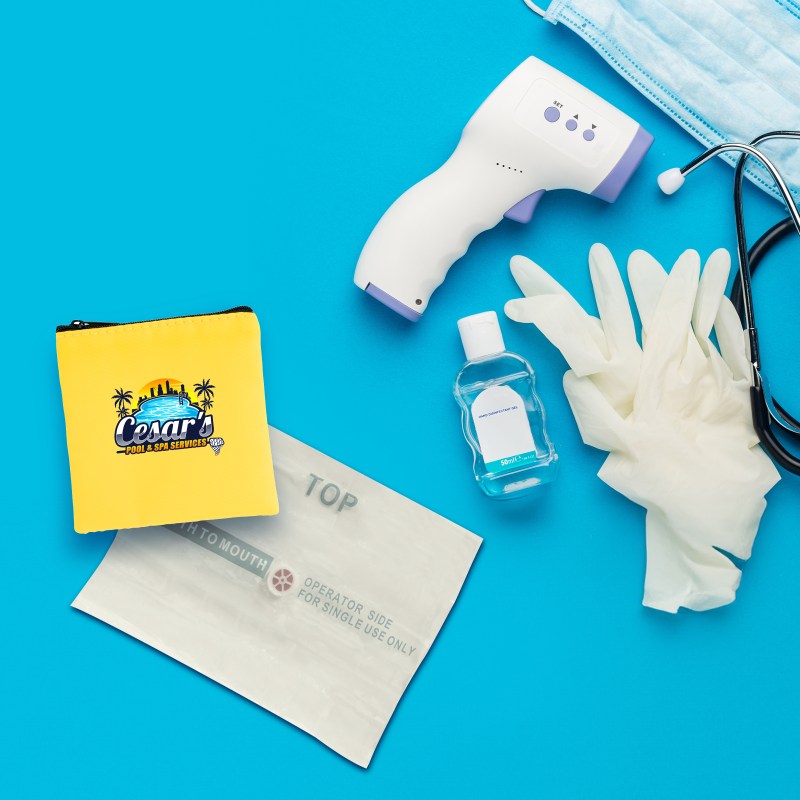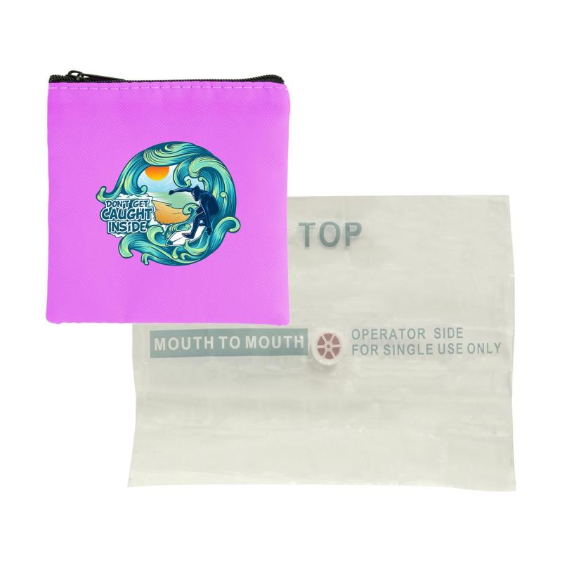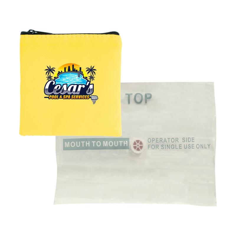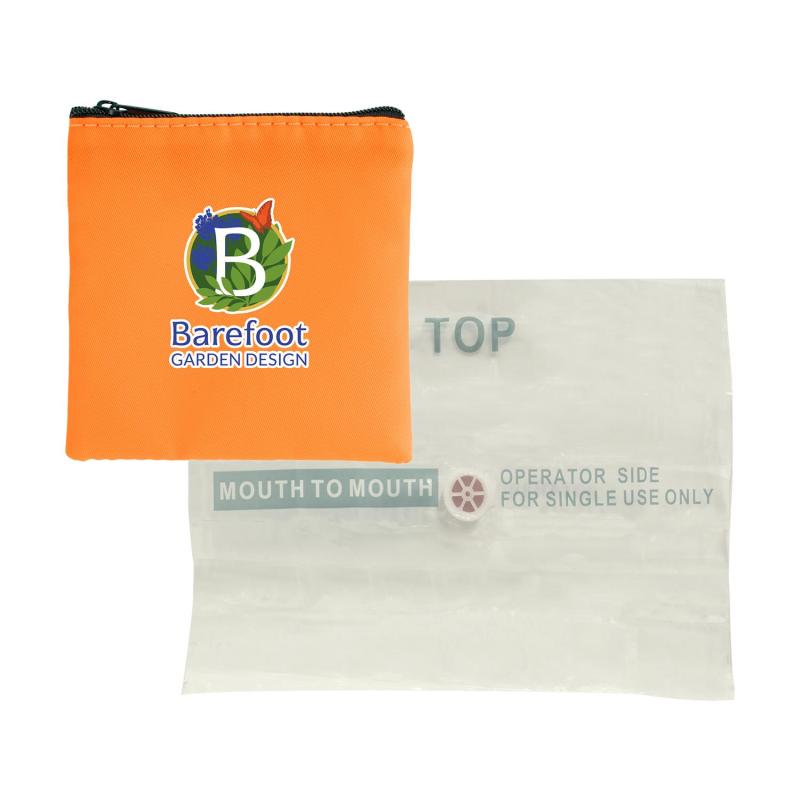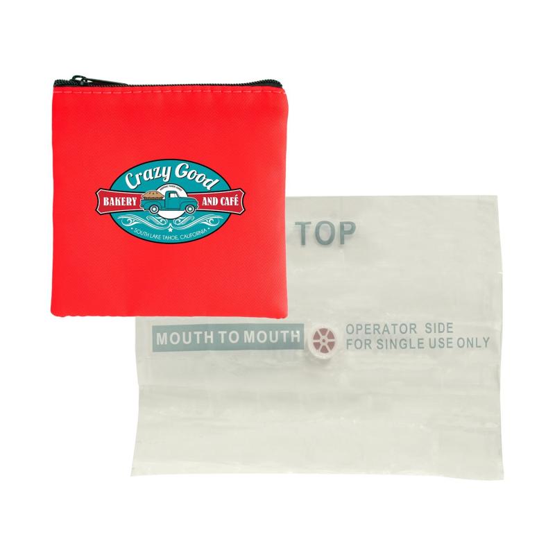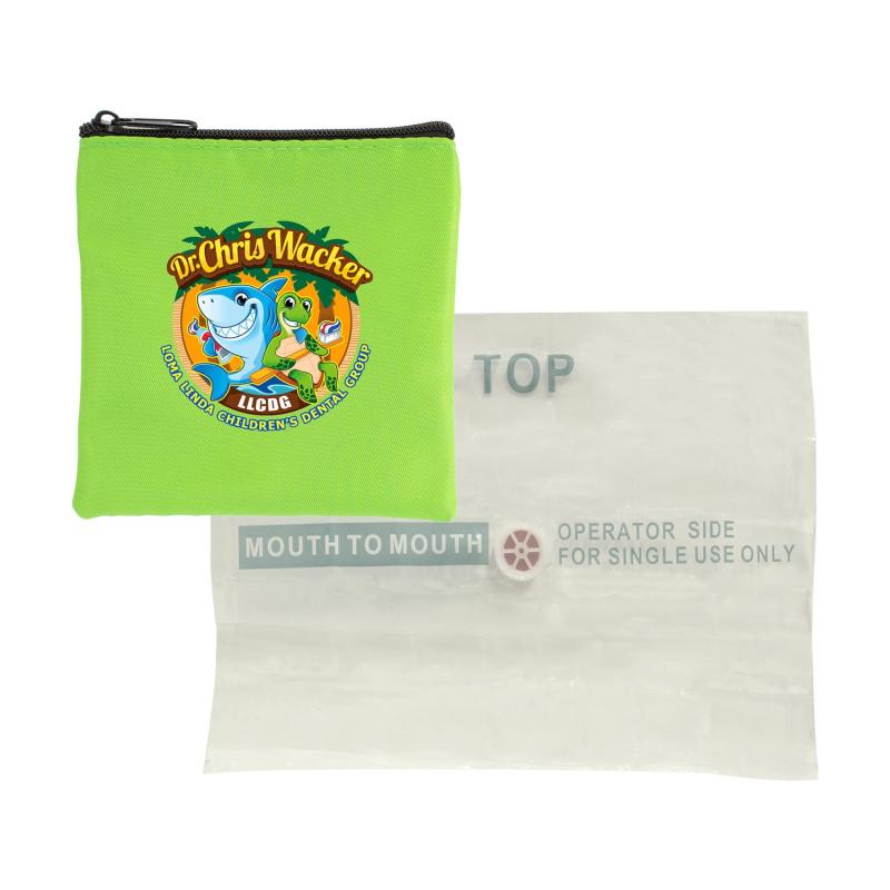RPET Tech Pouch with zip closure. Disposable Single use CPR face shield with one way valve. Complies with Prop 65. 4″ L x 4″ H