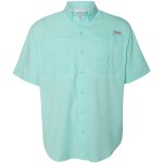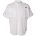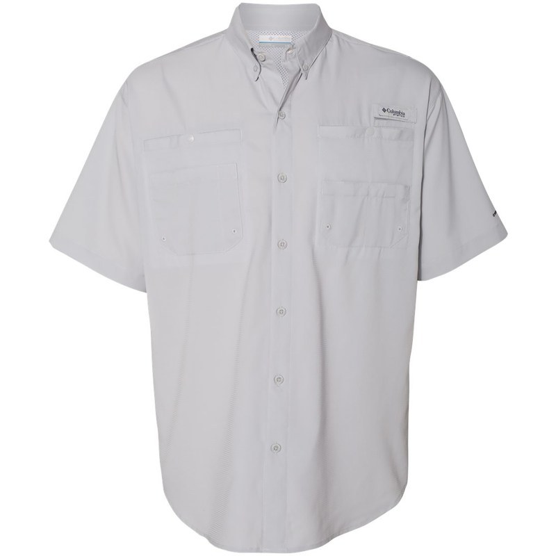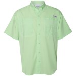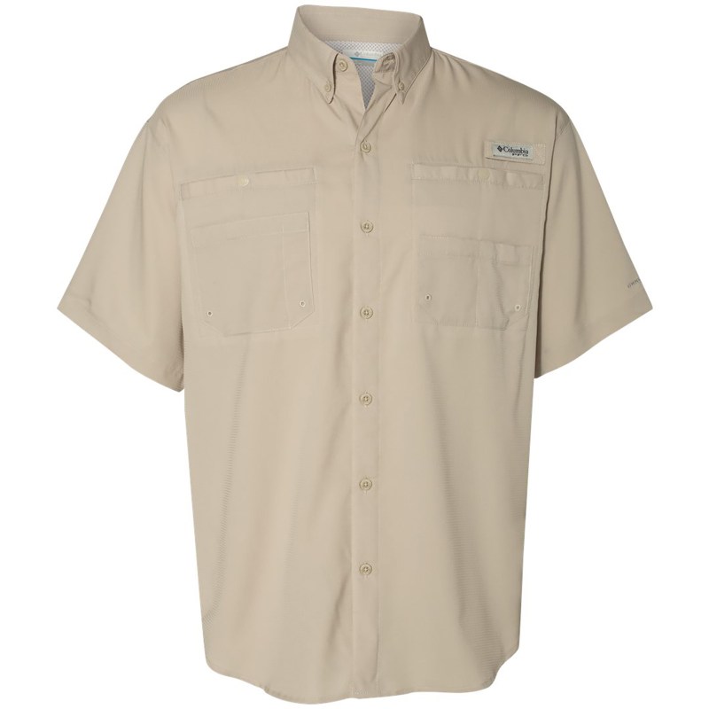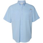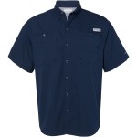 Hook-and-loop rod holder with Columbia logo on left chest. Mesh-lined vent at center back. Chest pockets with snap closure. Omni-Shade UPF 40 protection. Omni-Wick moisture-management properties. Sizes: S-3XL.