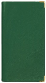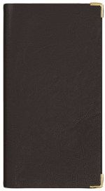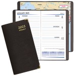 Weekly pocket planner. Smyth sewn with deluxe refillable Continental cover. 12 month, Jan. thru Dec., gilded pages, one week per opening, famous quotes on each week, phone/address, first aid, advanced planning, expense section, time zone map, and area code list. 6 1/2″ L x 3 1/2″ W