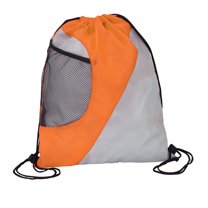 Sport bag has drawstring closure and gusseted mesh pocket. Drawstrings double as backpack straps. Complies with Prop 65. 13 1/4″ W x 16 1/4″ H x 3/16″ D