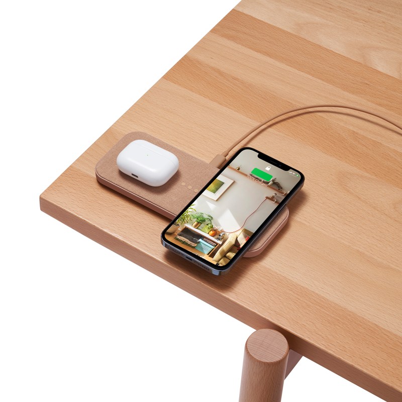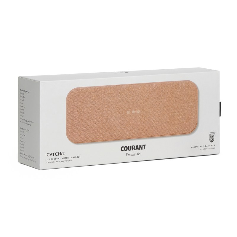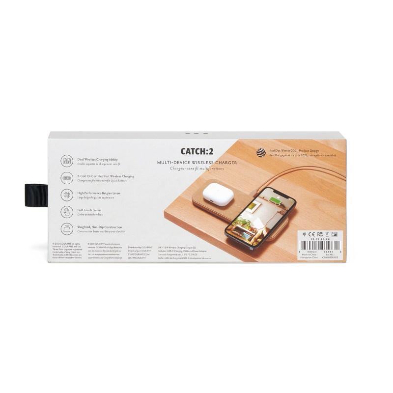 Multi-device wireless charging, without any of the drawbacks of “dead-zones”. The Courant Essentials CATCH:2’s 5-coil array allows for the most forgiving charging experience on the market for a multi-device charger. This product works best in settings such as living rooms (where two people can share a charge with two phones) or in an office where keeping both your phone and your wireless charging earbuds at full charge is paramount. Wirelessly charge up to two devices at once. Complies with CPSIA, Prop 65. 3.1″ W x 0.6″ H x 7.8″ L
