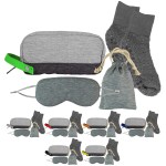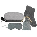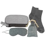 Elevate your travel experience with the Bay Travel Pouch featuring a colorful accent hand strap, perfect for adding a touch of style to your journey. Slip into ultimate comfort with the Gray Fuzzy Anti-Slip Socks, designed to keep your feet cozy and secure while on the move. Enhance your rest and relaxation with the Travel Sleep Mask Set, conveniently stored in a matching pouch for easy access. Plus, feel good knowing that all these items are crafted from recycled PET materials, making them not only stylish and functional but also environmentally friendly. Travel in style and sustainability with this exclusive set of travel essentials. Complies with Prop 65. 8″ L x 4.5″ H x 3.5″ W
