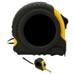 16′ x 3/4″ metric / inch metal blade, power lock, wrist strap, belt clip, ABS plastic case with protective rubber sleeve. Complies with Prop 65. 3″ W x 3″ H x 1 1/2″ D