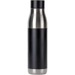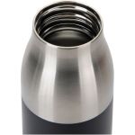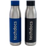 Carry this stylish bottle with you everywhere! Stainless steel bottle to hold your favorite beverage. Easy twist on locked lid that matches the color of the bottle. Choose from black or deep blue to show off a company message or logo. Hand wash recommended. Complies with Prop 65.