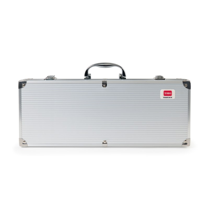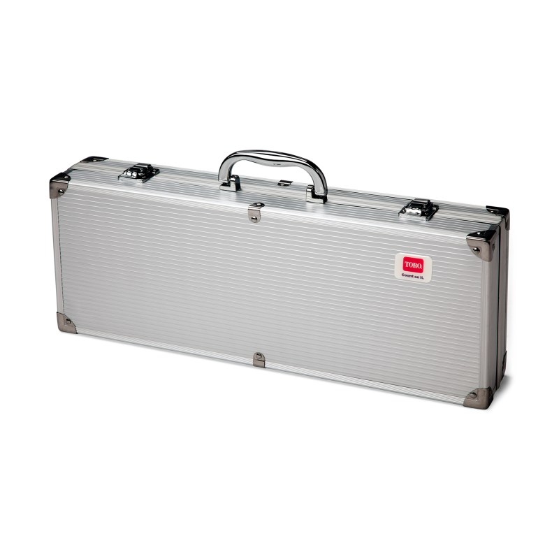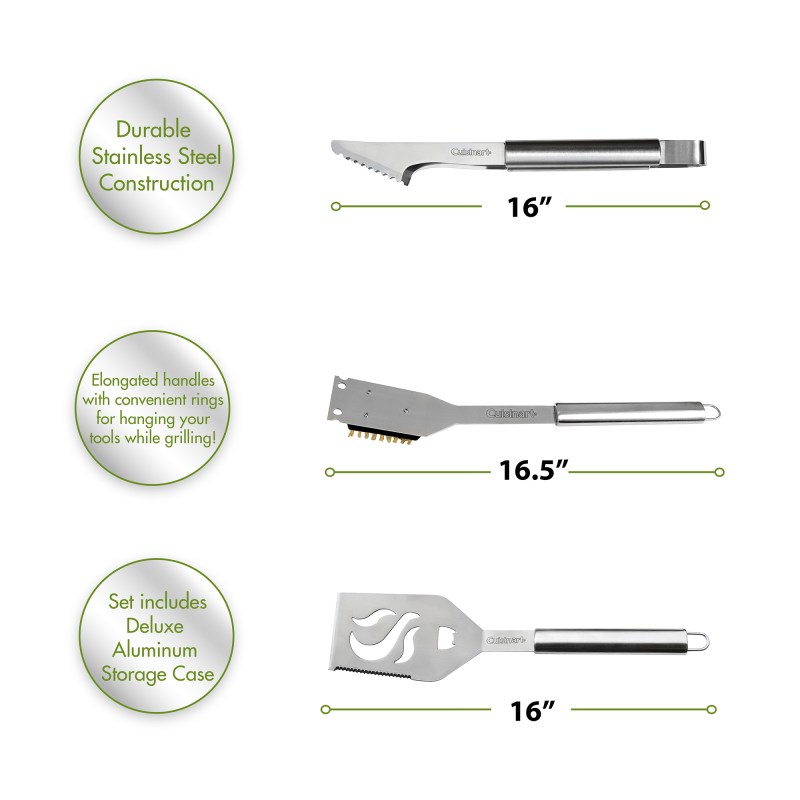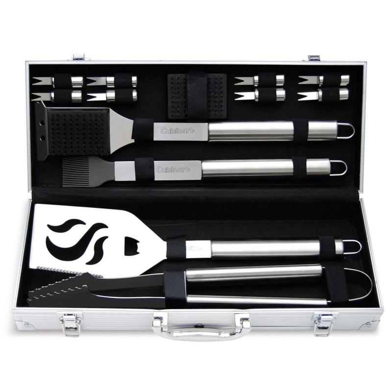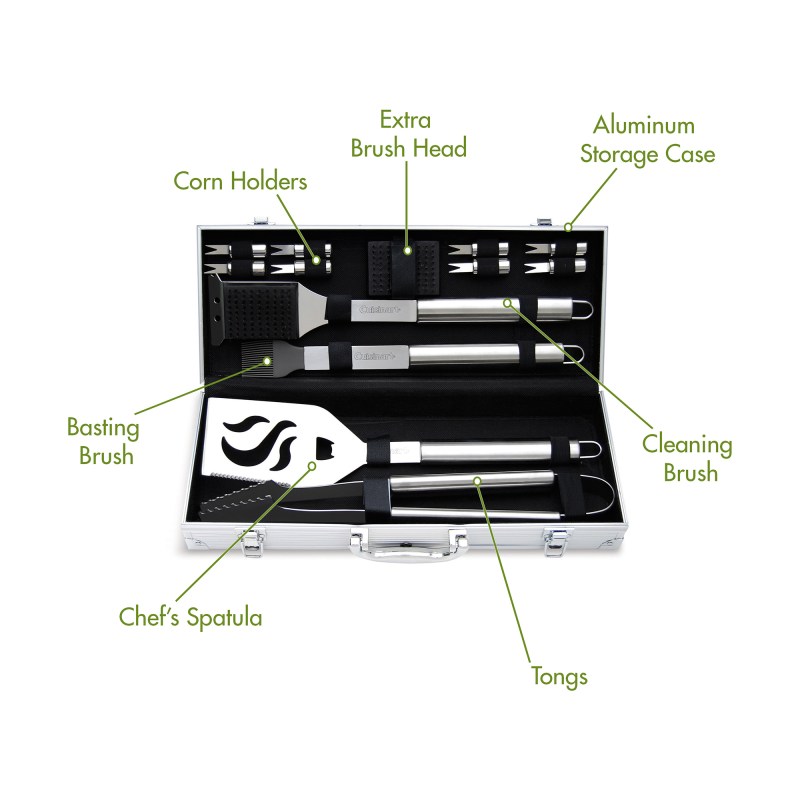 The Cuisinart(R) Deluxe 14 Piece Grilling Tool Set includes all the necessary tools to make your grilling experience easy and convenient. This durable set of stainless steel tools includes a Chef’s Spatula, Grill Tongs, Silicone Basting Brush, Cleaning Brush, Extra Cleaning Brush Head and 4 Pairs of Corn Holders. Each tool is designed with elongated handles and a hanging ring for convenient placement during grilling time. Complies with CPSIA, Prop 65. 3.2″ W x 7.1″ H x 17.3″ L