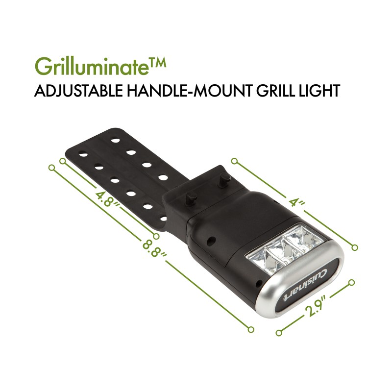 Portable or full-size grills, keep them grilling in the dark with the Cuisinart Grilluminate(TM) Adjustable Handle-Mount Grill Light. The strap is heat resistant and has notches that easily adjust to fit your portable or full-size grill handle. The bright COB light illuminates your grill to keep you grilling all night long! FITS ON MOST GRILLS: The adjustable strap makes for an easy installation and removal. The notches will size to fit most grill handles up to 1.5″ diameter. Complies with CPSIA, Prop 65. 2.97″ W x 1.5″ H x 9.13″ L