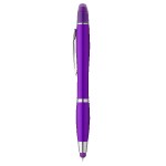 Three-in-one with capacitive touch stylus; twist action ballpoint pen; and gel wax highlighter tip that glides over text; will not bleed or smear! Highlighter color coordinates with barrel and cap color; comfort grip with shiny silver accents and matching metal clip; satin colored metallic barrel. Silver comes with yellow highlighter and clear cap. Black ballpoint ink. 5.3125″ D x 0.5″ W
