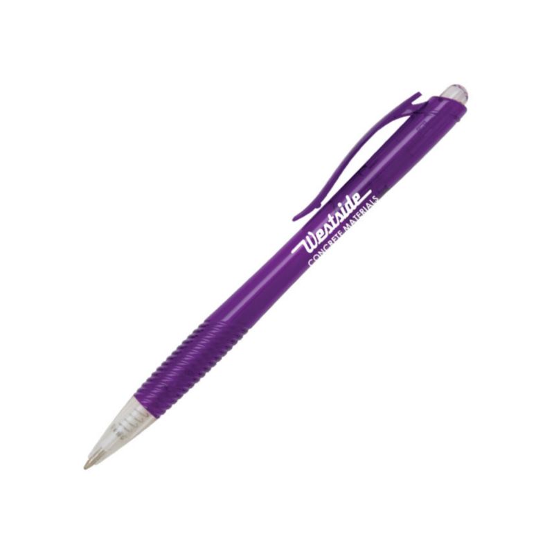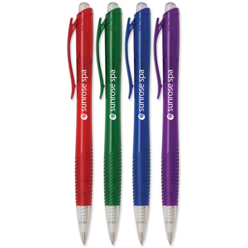 Up to 4 lines of copy FREE on the – Ergo Scholar Click Pen. Translucent barrel. Textured grip & plunger. Retractable action. Ergonomic design. Black or blue ink. Complies with Prop 65.