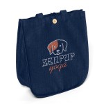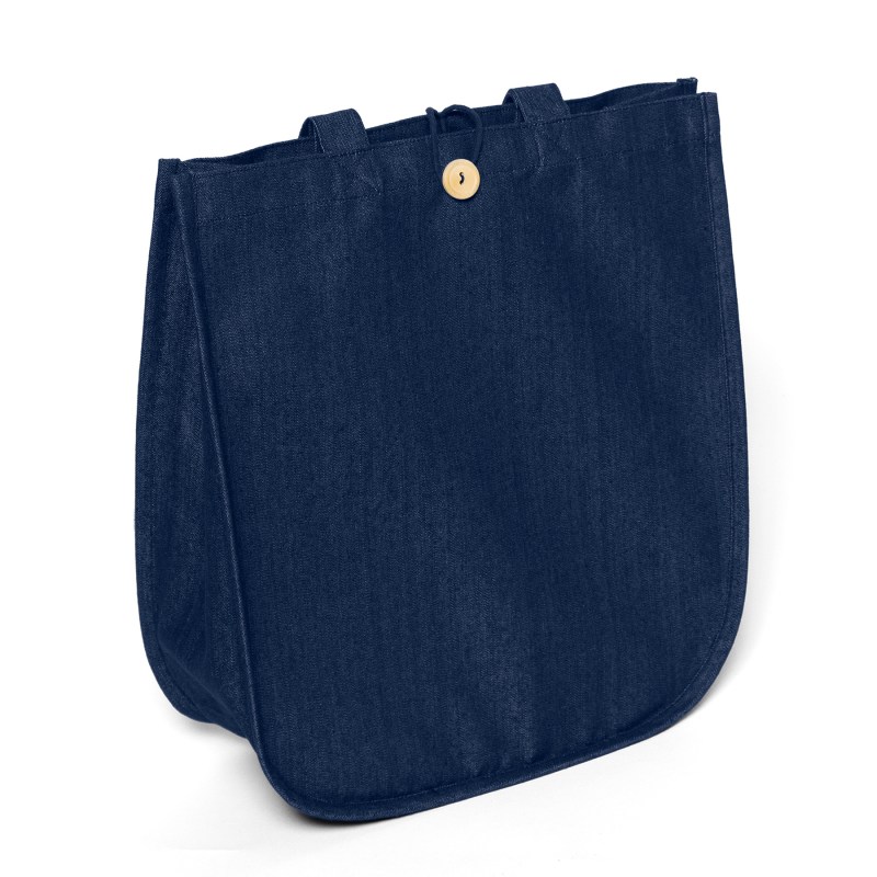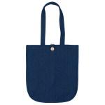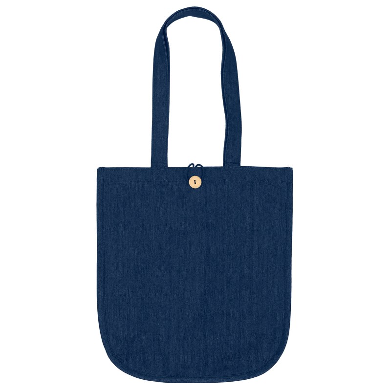 The reusable Dan™ Denim Tote is made of durable 12 oz. cotton with a classic dark-wash denim look. The bag features a stylish curved bottom, a wooden button with loop closure, and 28″ long denim handles. Complies with CPSIA, C-TPAT, Prop 65. 15″ W x 6″ D x 17″ H