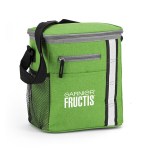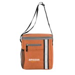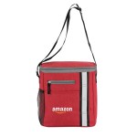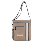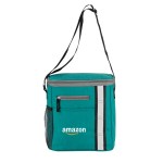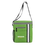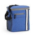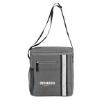 300D heathered polyester lunch bag with insulated gray PEVA lining. Top zip main compartment; two front pockets; side mesh pocket; two-tone webbing and gray accent trim; adjustable shoulder strap; 12 can capacity. 5.75″ D x 10.625″ H x 9.75″ W