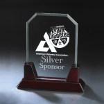 Acknowledging tradition with a contemporary angle, this glass rectangle plaque sports polished bevels, clipped beveled corners, and a glowing rosewood base. 7.0″ W x 8.0″ H x 3.0″ D