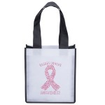 The 80 GSM Degas PET Non-Woven Totes feature white front and back panels, accented by black gussets, piping, and handles. An optional plastic bottom insert is available for purchase. Handles measure 1 1/2″W x 20″ long. 9″ W x 5″ D x 10″ H