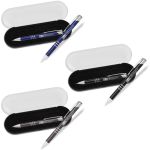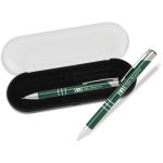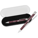 Up to 5 lines of copy FREE on this custom engraved metal pen & pencil set! High quality, laser engraved promotional pen & pencil set. Hi-gloss finish and stylish, silver accents. Patented lathe lines around each barrel. Mechanical pencil for precision writing. Complies with Prop 65.