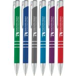 Unique Soft Feeling Barrel – Triple Soft-Tech Click Pen. Pens are packaged individually in Cello Wrap. Four colors to choose from. Chrome accents. Triple lathe line accents. Complies with Prop 65.