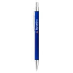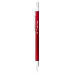 Plunge-action soft touch coated ballpoint pen. Silver plunger, clip and tip; slim aluminum barrel. Black ballpoint ink. 5.5″ D x 0.3″ W