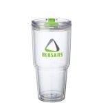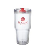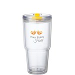 The Desire 26 oz. tumbler will keep your hot or cold drinks at just the right temperature. It is made from clear AS plastic and has a clear lid with colorful rotating closure and a silicone seal. Complies with Prop 65. 4 1/8″ W x 7 7/8″ H x 3 7/8″ D