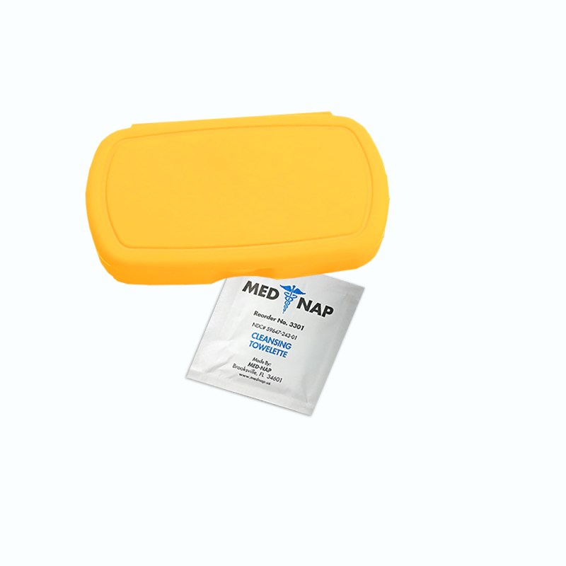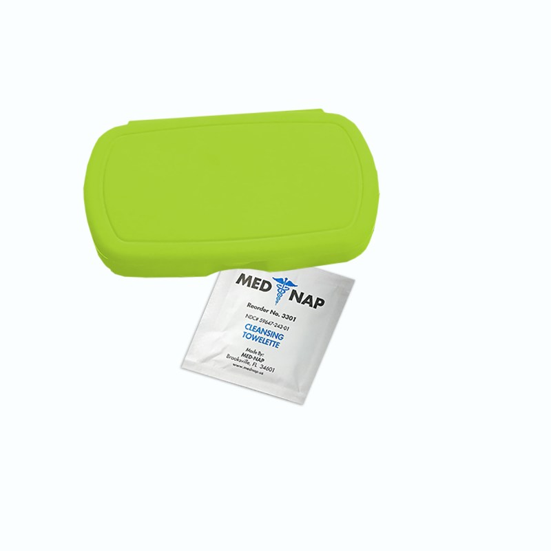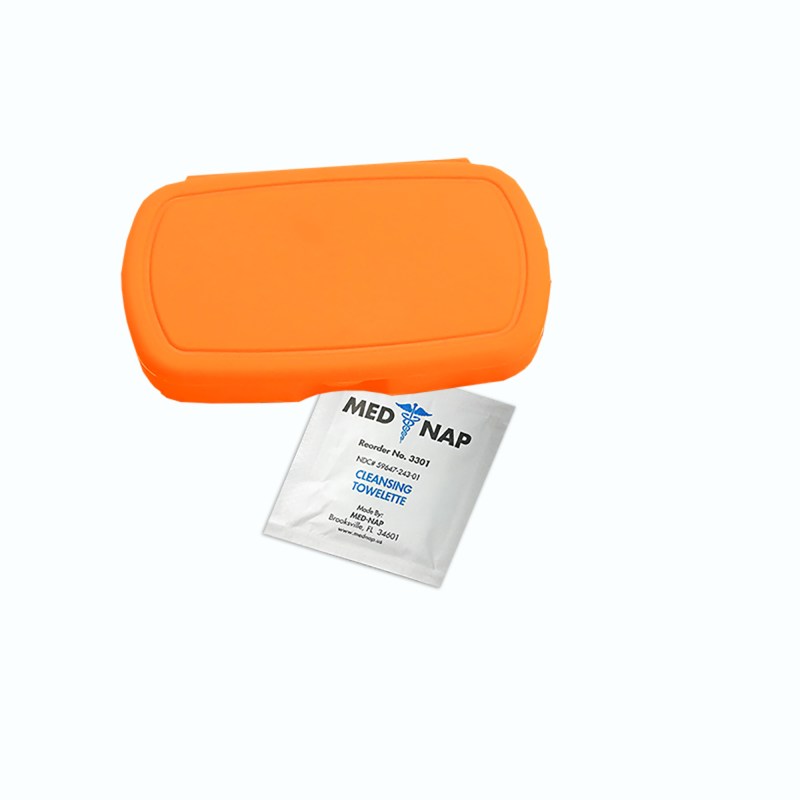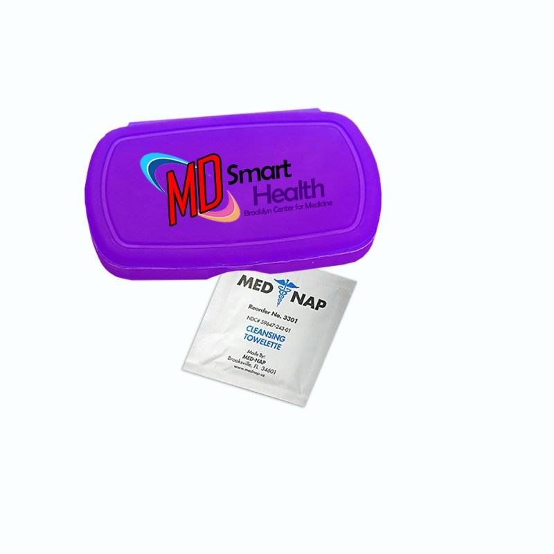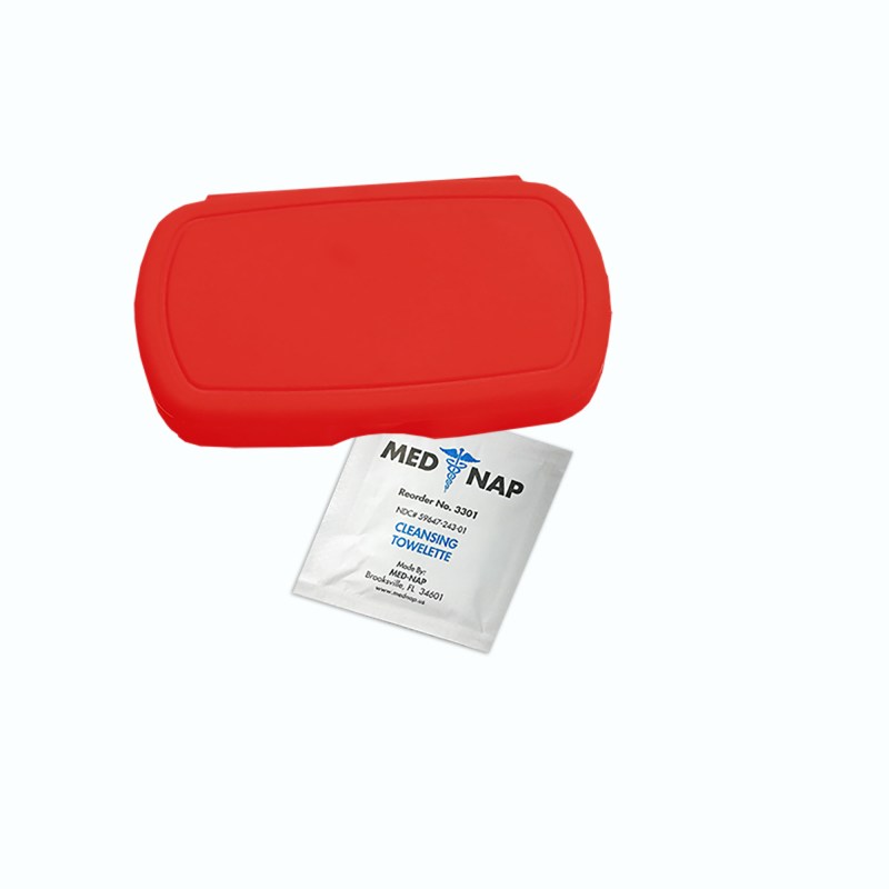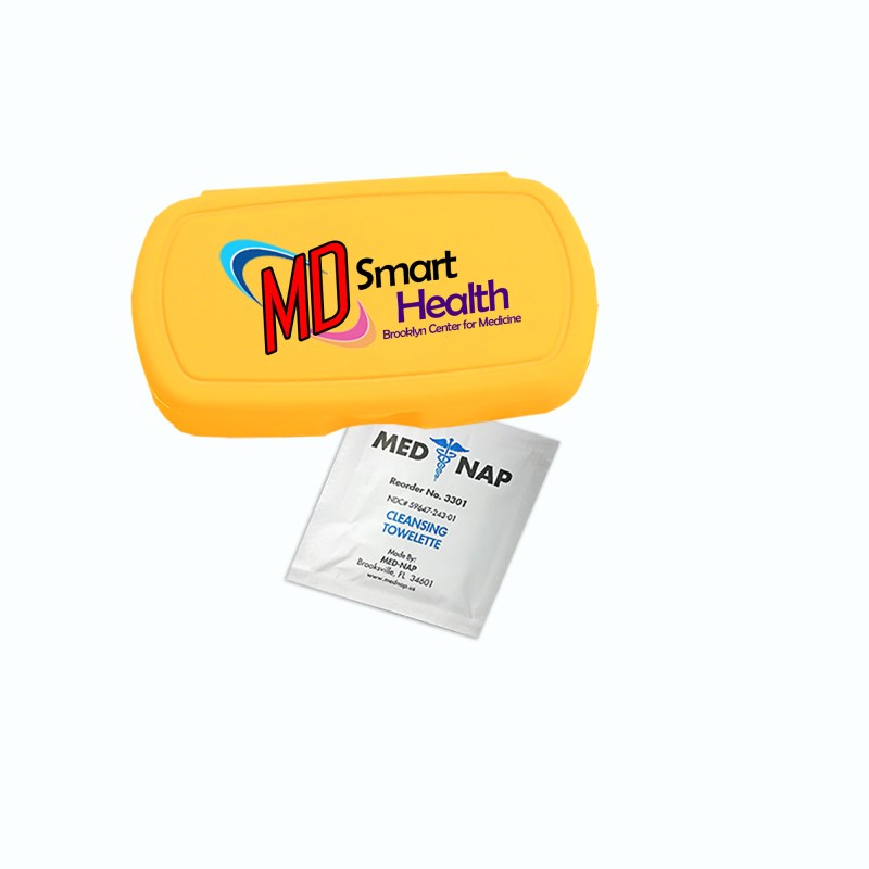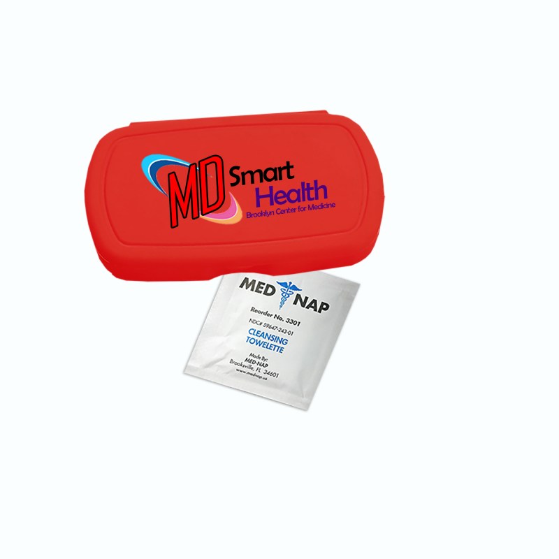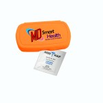 Digitally imprinted oval design living hinge box is available in 9 colors. contains four latex free adhesive bandages. one antiseptic towelette. one triple antibiotic ointment packet. Complies with ANSI, CPSIA, FDA, Prop 65. 4″ H x 2.375″ W x 0.5625″ D