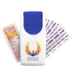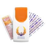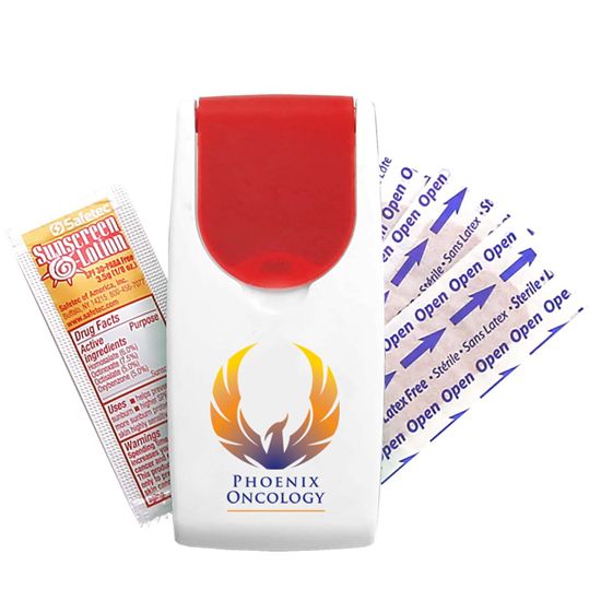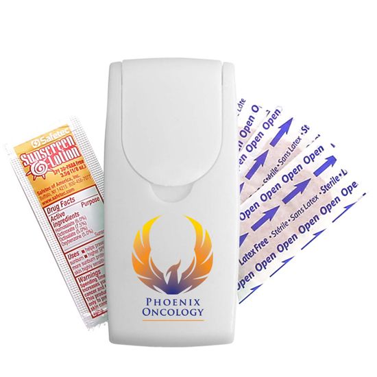Digital Imprint When you have an outdoor event coming up these flip top sun kits will come in quite handy! With a sleek and colorful design these first aid containers include 2 sunscreen packets and 2 adhesive bandages. Imprint with your company name or logo. A creative promotional giveaway to give out at medical conventions and awareness campaigns. Great for hotels. schools and travel agencies too! Complies with ANSI, CPSIA, FDA, Prop 65. 4 3/8″ H x 2.0625″ W x 0.5″ D