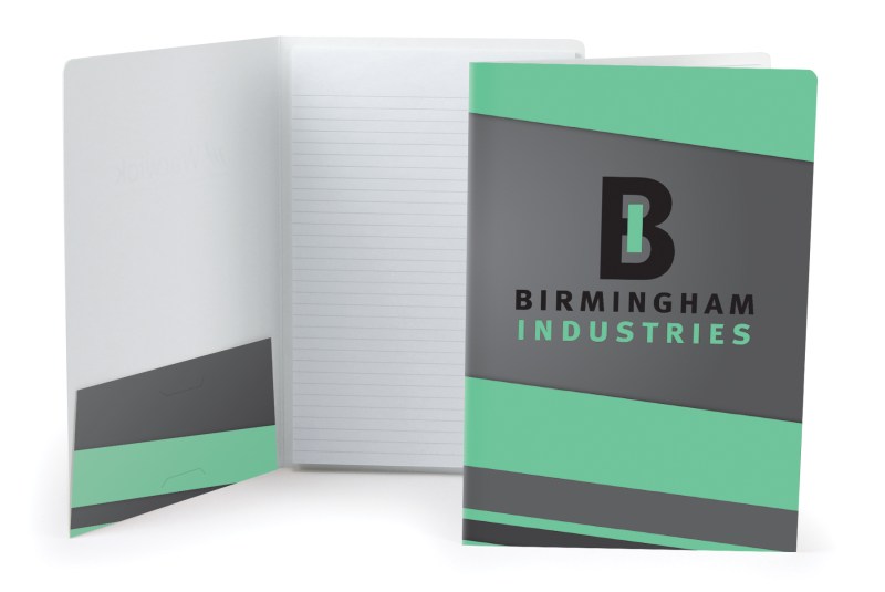 6.5″ x 9.5″ Mini Padfolio with full color, full coverage printing on front & back covers and inside pocket on 12 pt. coated white stock. Inside is a 20 sheet 6″ x 9″ lined writing pad & business card slits on the inside pocket and a pen loop (pen not included). Low cost & perfect for meetings, schools & colleges, tradeshow traffic builder, training programs and anywhere notes are needed. Inside cover printing available at an additional charge. 6 1/2″ W x 9 1/2″ H