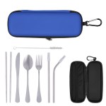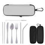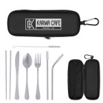 Includes Knife, Fork, Spoon, Pair Of Chopsticks, Two Straws With Silicone Tip And Wire Cleaning Brush. Protective Zippered Pouch For Convenient Travel. Carabiner Attachment. Not for Climbing. Meets FDA Requirements. BPA Free.