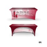 The Poly Stretch 6′ Open Back Table Cover is ideal for trade shows, product launches, exhibitions and presentations. Its easy to manage as it is made of polyester, is machine washable, ironable and fire-retardant treated. This cover is created for a 6 table with dimensions 72 x 30 x 29. It is highly elastic and has rubber feet for the table legs, creating a clean tight fit. This 3-sided table cover leaves the back open for you to rest your legs and easily access items underneath your table. Carry this table cover in its PVC zippered carrying bag. Utilize its full color dye sublimation printing to create vivid images and promote your brand! EQP does not apply on DisplaySplash orders. Complies with Prop 65. 72″ W x 30″ H x 29″ D