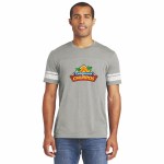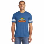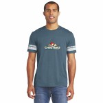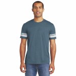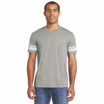 Evoke a sense of nostalgia with the distressed printed stripes adorning the sleeves of this tee, giving it a retro, game-day inspired look. The tear-away tag ensures maximum comfort and convenience.