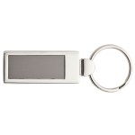 Rectangular keyring with split ring, shiny nickel finish and a brushed gunmetal plate. Complies with Prop 65. 1 1/8″ W x 3 1/8″ H x 1/4″ D