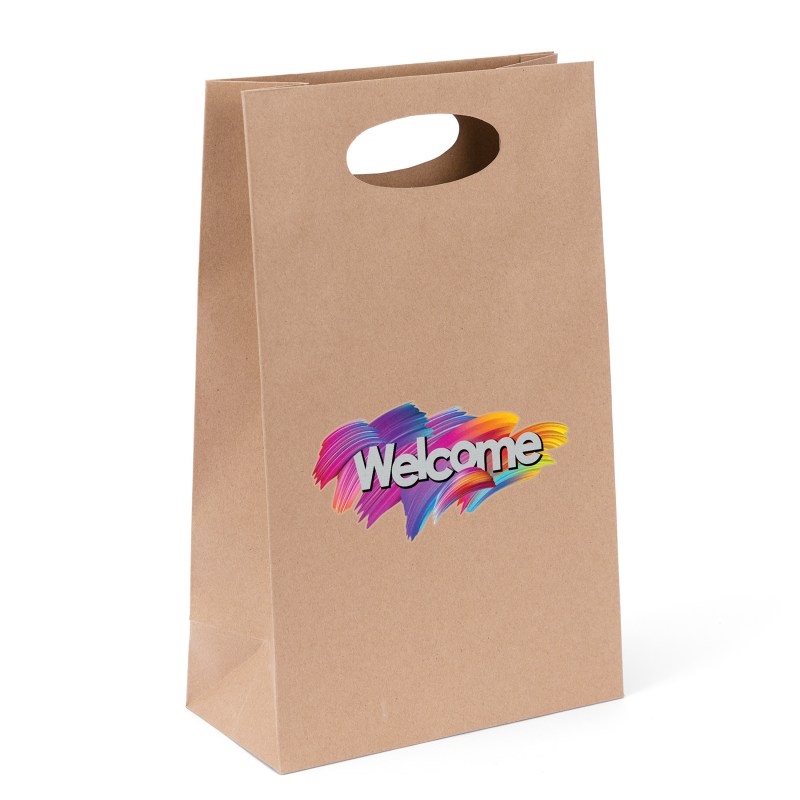 The Eco Die Cut Shopper bags are made with 100% recycled paper with a minimum of 60% post consumer content. The bags feature 140 GSM Eco kraft paper and die cut handles. Available in two sizes (Donna and Karen) and with multiple imprint options. Complies with CPSIA, C-TPAT, FDA, Prop 65. 8″ W x 13″ H x 4″ D