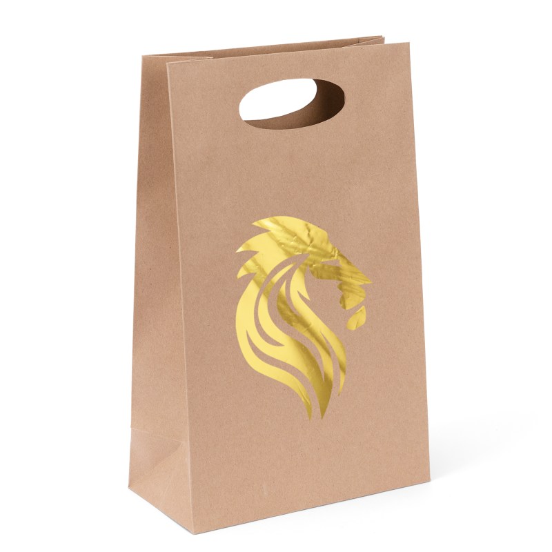 The Eco Die Cut Shopper bags are made with 100% recycled paper with a minimum of 60% post consumer content. The bags feature 140 GSM Eco kraft paper and die cut handles. Available in two sizes (Donna and Karen) and with multiple imprint options. Complies with CPSIA, C-TPAT, FDA, Prop 65. 8″ W x 13″ H x 4″ D