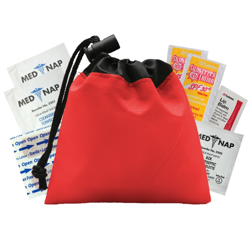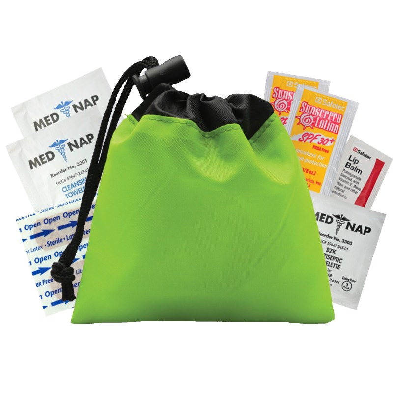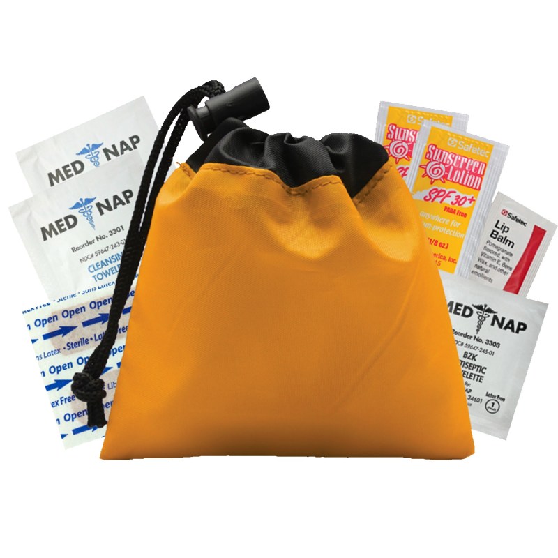 Brightly colored polyester drawstring bag compact and excellent for trade show giveaways Contains outdoor sun essentials Cinch Tote Sun Kit. Complies with ANSI, CPSIA, Prop 65. 5″ W x 5″ H