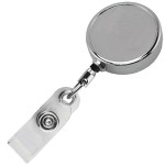 Chrome metal retractable badge reel. This badge holder extends up to 30″ for convenient badge swiping, then quickly retracts! The reel is made of high quality stainless steel. Back In Stock End of February. 1 1/4″ Diameter