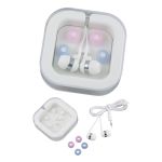 Cricket – Ear Buds and Case. Interchangeable earbuds ( 2 blue, 2 pink, 2 white) with travel storage case. Compatible with all headphone jacks. 2 7/8 W x 3/4 H x 2 7/8 D. 2.875″ W x 0.75″ H x 2.875″ D
