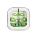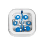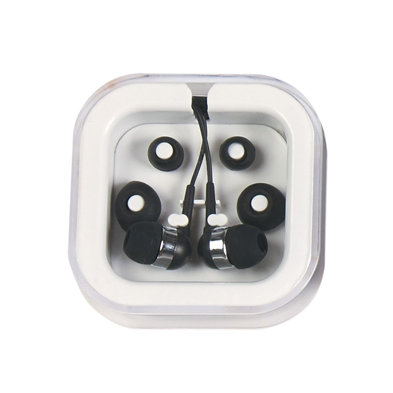 Protective Plastic Travel Case. Interchangeable Earbud Covers. Works With Most Audio Devices. 48″ Cord. Complies with Prop 65. 2.75″ W x 2.75″ H