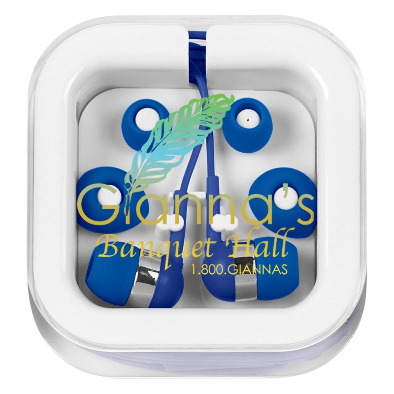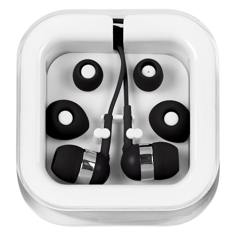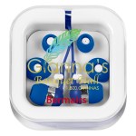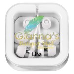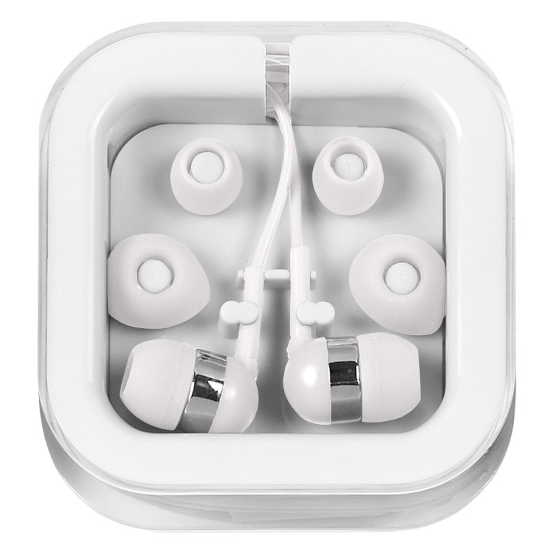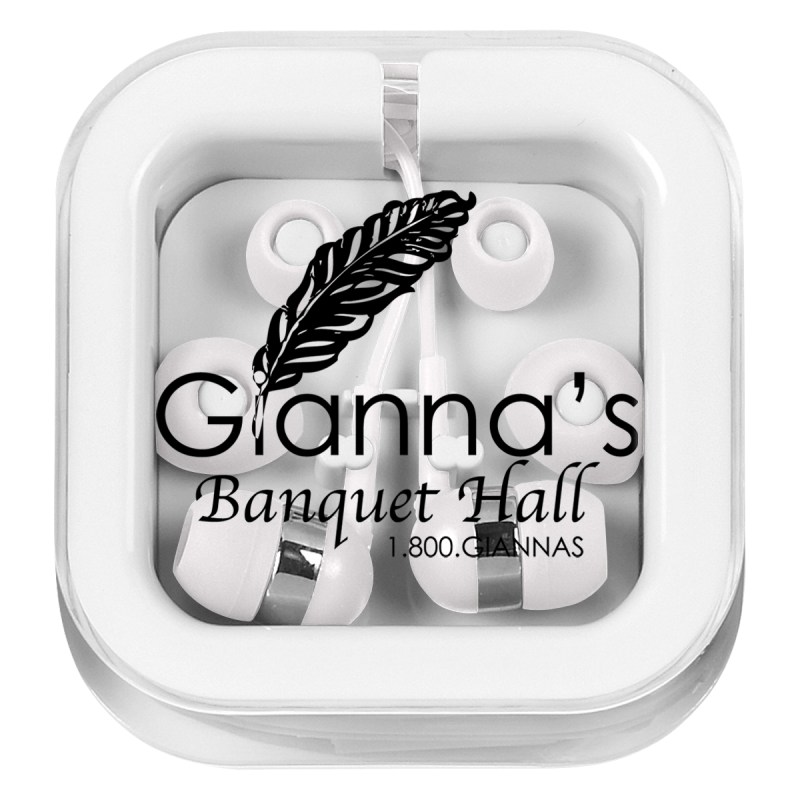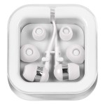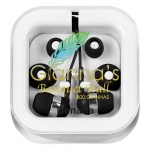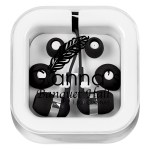 Protective Plastic Travel Case. Built-In Hands-Free Microphone. Interchangeable Earbud Covers. Works With Most Audio Devices. 48″ Cord. Complies with Prop 65. 2.75″ W x 2.75″ H