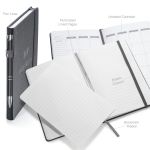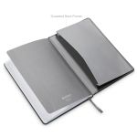 The Eccolo® Memphis Journal w/Elastic Pen Loop is a sophisticated, top-quality journal to take you from meeting to meeting. Features: – 5.75 x 8.25- Perforated FSC Paper 192 pp- Lined- 4 colors – PMS cool gray 11C: Black : Red PMS 4060: Navy PMS 648c- Matching elastic bands- Matching Bookmark ribbon- Pen loop in spine- Undated calendar in rear section- Inside back cover gusset pocket- End pages gray 7U- Deboss. 5.75″ W x 8.25″ H