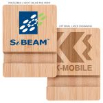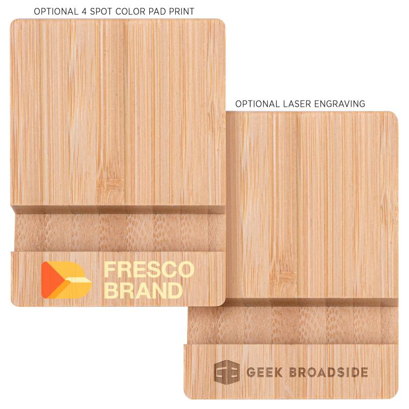 Made of high-quality bamboo wood. Perfect for holding mobile devices of many sizes. Lightweight and compact. The angled channel holds mobile devices at an optimal angle. Bamboo is a far more sustainable wood and harvesting it has a lesser environmental impact. 3rd Imprint Option: (Optional – Front – Pad): 1 1/2″w x .375″h. 4th Imprint Option: (Optional – Front – Laser Engraved): 1 1/2″w x .375″h. Complies with Prop 65. 2 3/8″ W x 3 1/8″ L x 3/4″ H